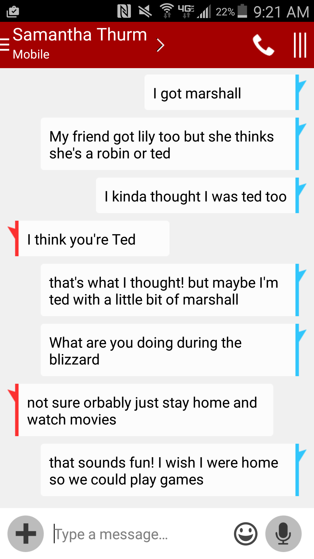 9:13 AM, the stationary bike – I text my sister while I’m moving my legs. We’ve been talking about which How I Met Your Mother character we are, based on a conversation I was having with my friend Eve about this last night (she’s Robin/Ted, I’m Ted/Marshall). My sister, who took a BuzzFeed quiz to determine that she was Lily, responds immediately: She thinks I’m Ted. I tell her I wish I were home so we could watch movies and play board games during the blizzard, which is true. She agrees. She’s the best.
